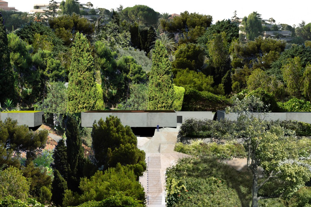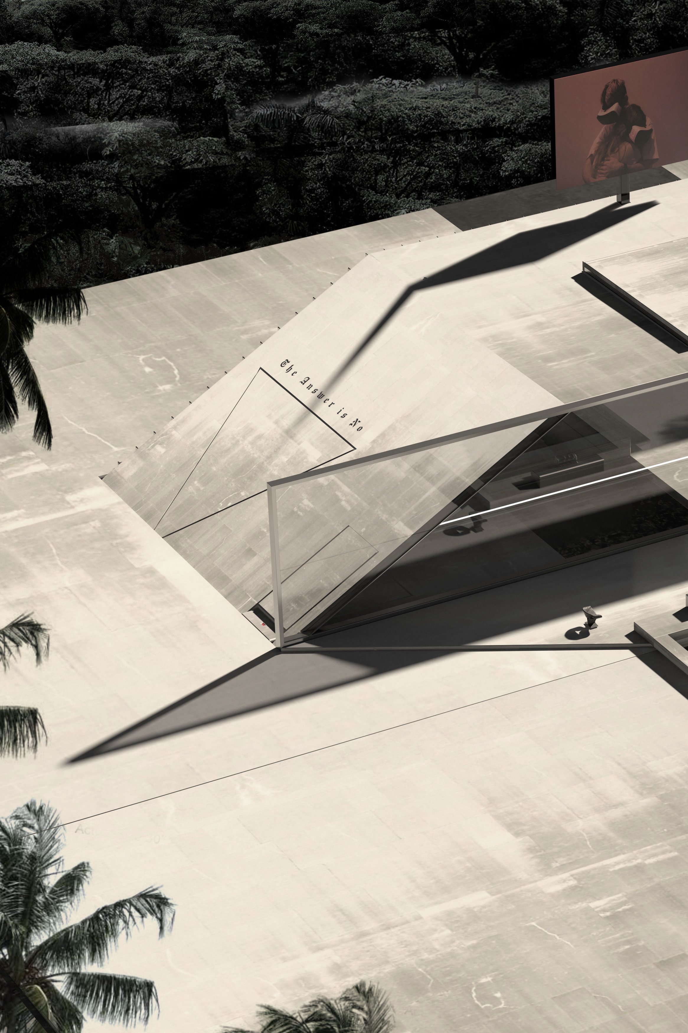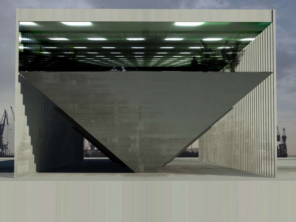 The well is a source of life and a man-made equivalent of an oasis. The cube is placed into a cool and shaded base on – 6.00m. A grotto generates a magic glow of indirect sunlight and a palm garden is trying to increase the local beauty of the adjacent and the already partly greened desert.
