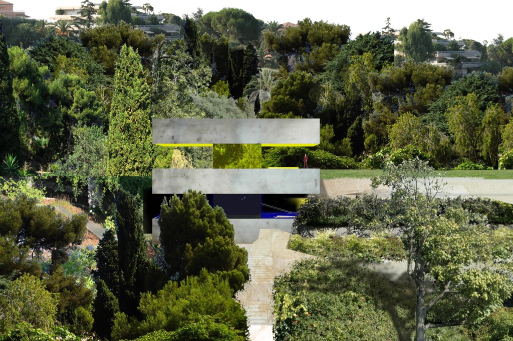 Autarkic house including an entry security zone, an indoor tropical garden, an outdoor desert and a cooling water level, penetrated by circulation partly inside and partly outside the house. A three-step security room-filter sequence offers a calm and secure space inside.