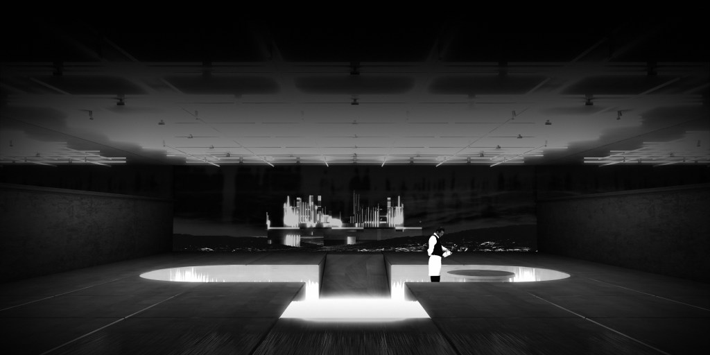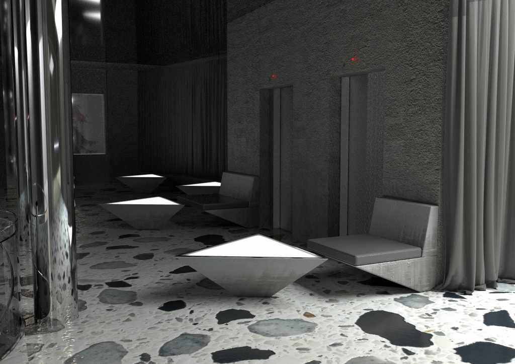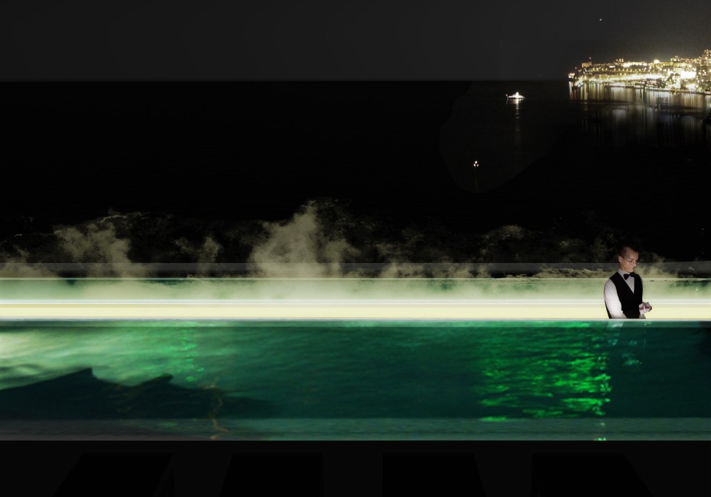 Above: Butler rental agency to book in case of need on daily base. Sunken functions layout space. Below: Residential Blade on top of a Water Fall. One floor = One Panorama Apartment. Layout dimensions of a flat are 3m x 80m. This is the most radical panorama approach ever designed.