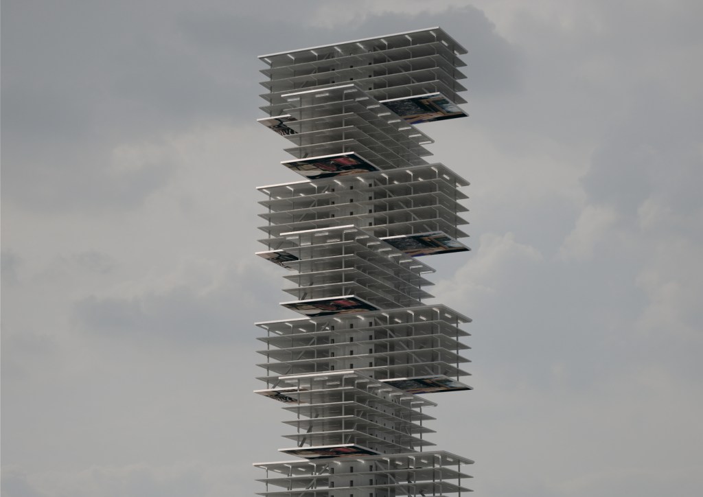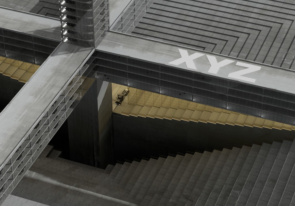 First building ever designed in Excel. Office building as walk-in Excel spreadsheet (Begehbare Exceltabelle). Switch floor to switch mindset. Increasing level of action towards ground floor, increasing level of calm hotel-like office-space towards top floors. Competition, Berlin. * 2018