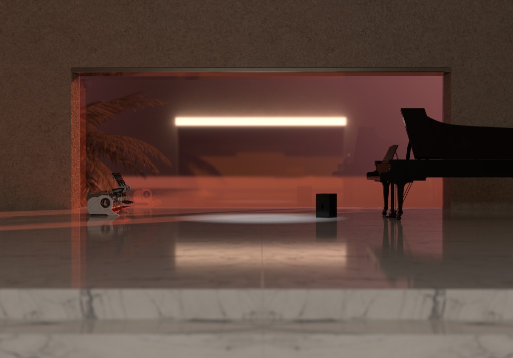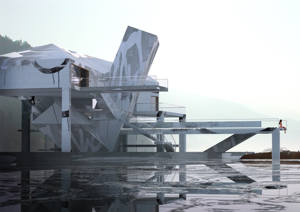 A bedroom is facing the moon-light illuminated underwater through a Plexiglass wall with integrated fish. Dreams become reality. This house tries to avoid standard family elements such as windows, doors and roofs and offers a unique and personal private space.