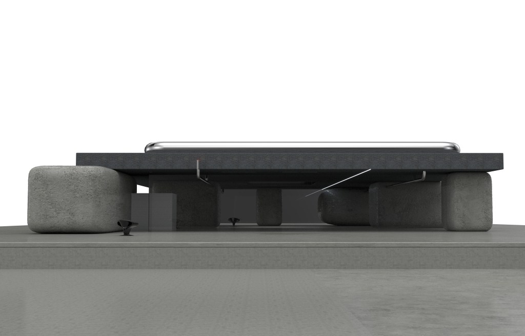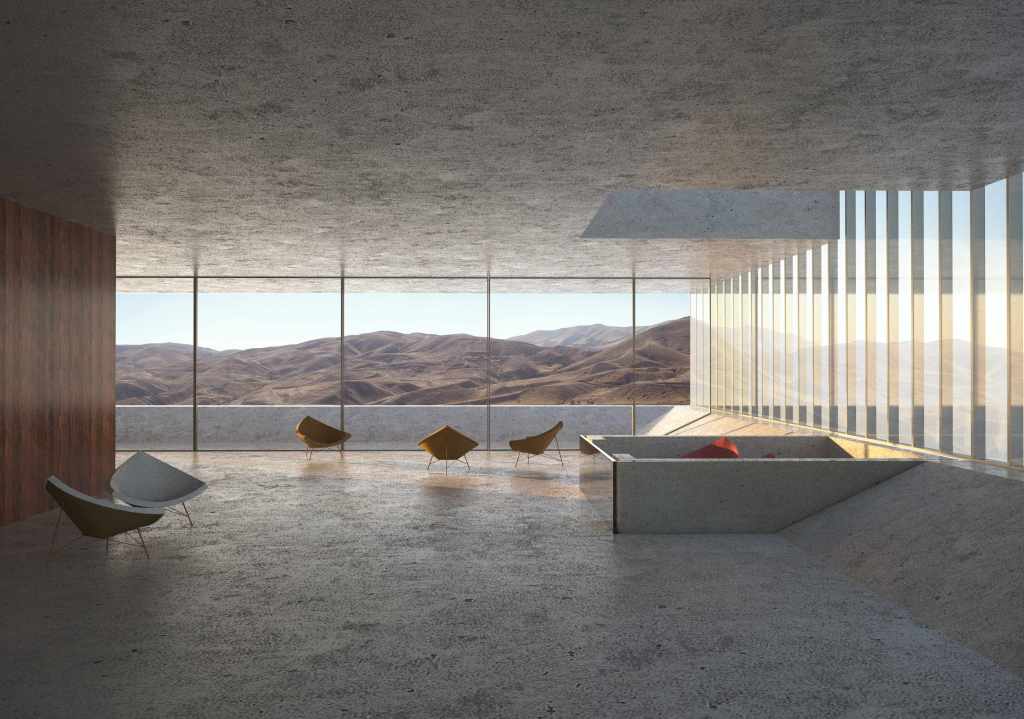 A solid and permanent ceiling with exposed technology can be easily adapted to future changes. Only seemingly random rocks support the roof and house private spaces. All other areas are open, connecting nature directly with the interior – which also extends the interior to the exterior by retracting all glass facades into the concrete rock garages.
