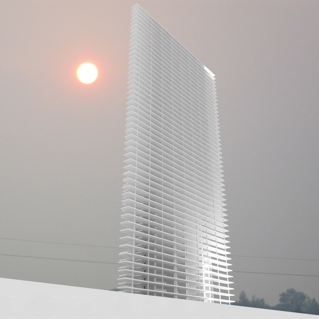 Flat White Tower. 3m x 64m multi-use floor space layout. This is not an office tower, nor a residential tower. It is an undefined factory floor for all purposes. Including flexible action offices, calm hotel-like residentials, weird hotel space, production factories and minigolf. * 2011