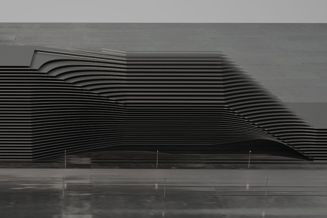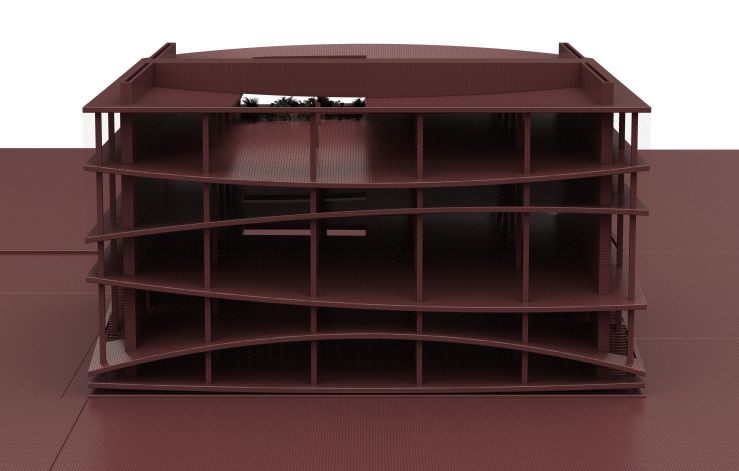 3km of offices are wrapped around five stacked court rooms. These offices are interwoven in a natural way so the complex internal organisation shortcuts are fulfilled. The court room offers panorama view to the sand dunes of The Hague.