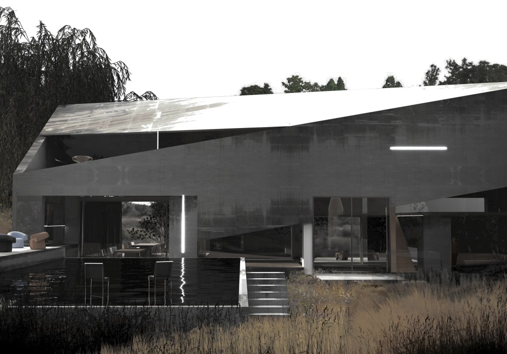 Hexagonal private house with a lake and mirror walls. The entrance tunnel dives through the lake into the multifunctional kitchen-space.